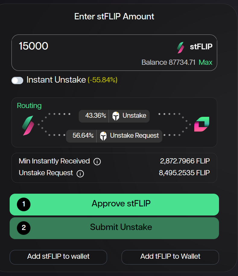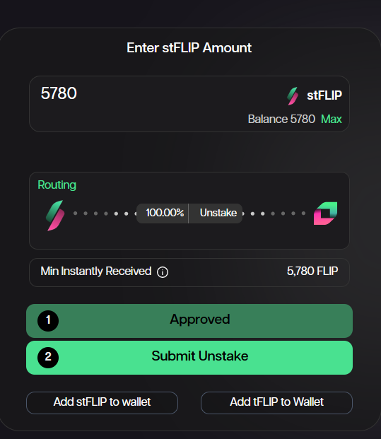 Once your wallet is connected and stFLIP is approved, enter how many stFLIP you would like to unstake for FLIP.