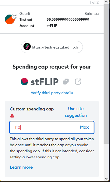 The example below shows a wallet with 99.99 stfLIP, but the spending cap to approve set at 110. This is an example, as our website will automatically select a % buffer higher than the owned stFLIP amount. The important thing is to not reset this to 'max' when unstaking as the transaction is likely to fail.